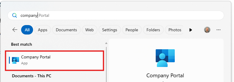 - Click on the Start Menu and Type Company Portal and click on the icon
