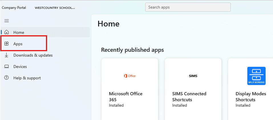 - Once Company Portal has loaded, Click on the Apps button on the left hand side.